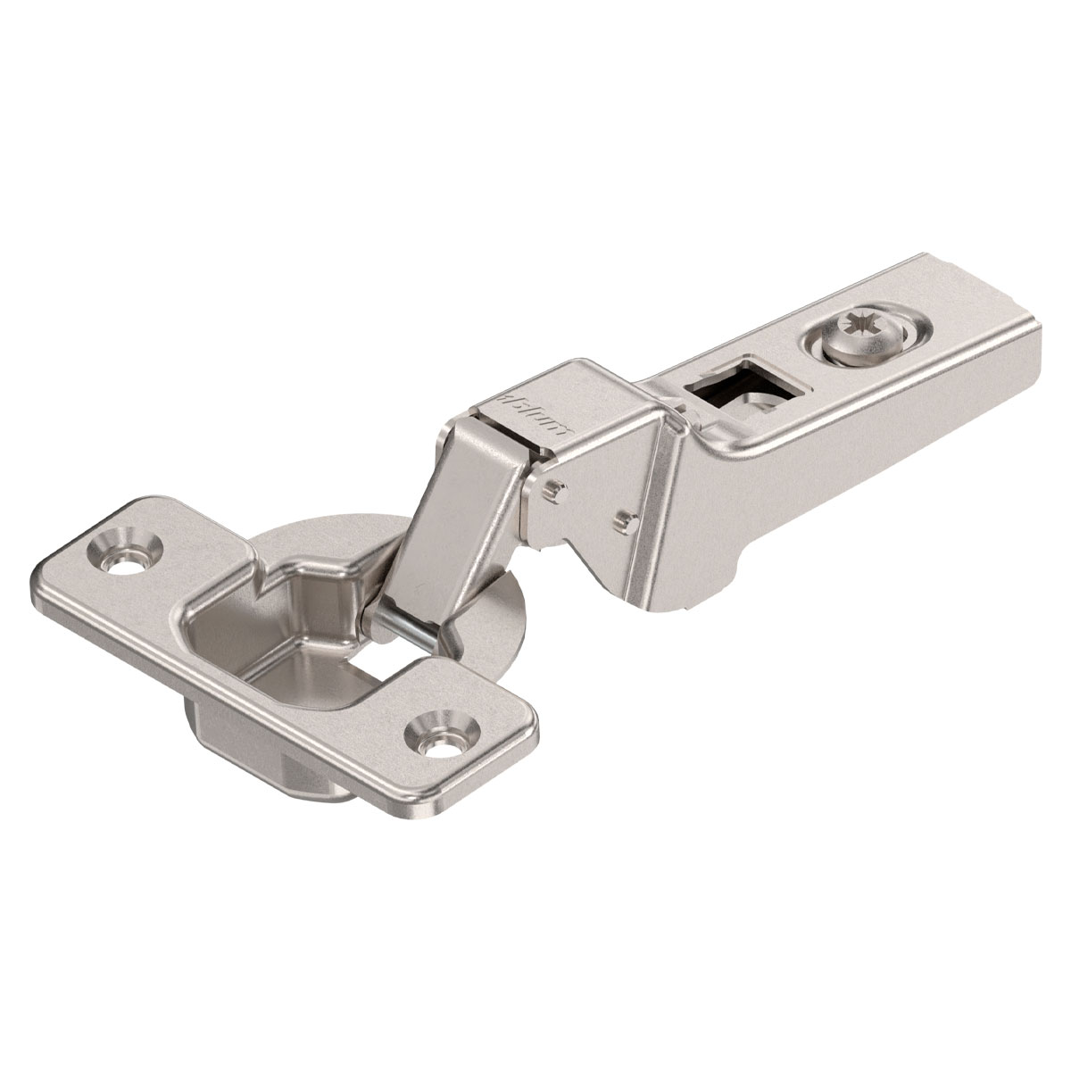 Bisagra CLIP 100°, medio cubrimiento total, acabado níquel, concentra una técnica innovadora, el diseño reconocido internacionalmente y la comodidad de movimiento en un espacio muy reducido.
