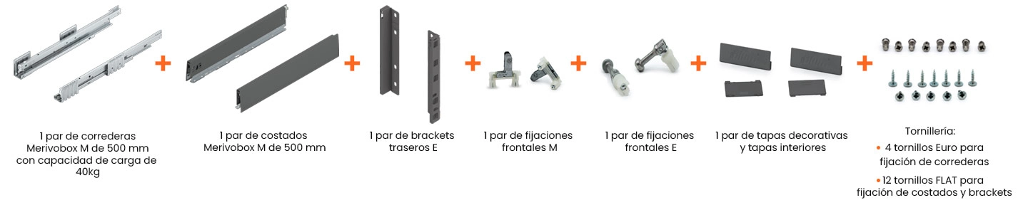 Todos los componentes necesarios para el armado de un cajón MERIVOBOX E contenidos en un solo empaque. Seleccione el tipo de cajón para poder adquirir los elementos adicionales del cajón de galerías, BOXCAP o BOXCOVER.