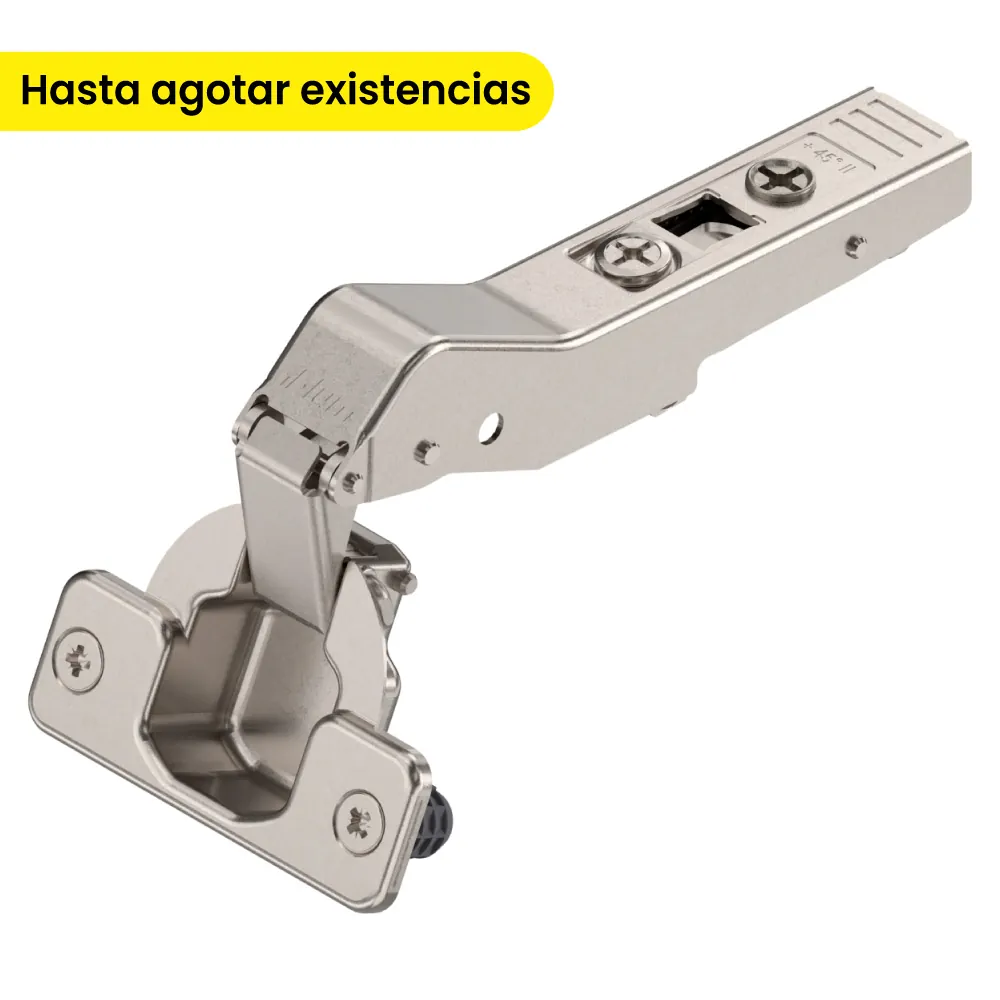 Bisagra CLIP top mueble de 45°, apertura 110°, 0 obstrucción, es ideal para armarios con cajones internos o entrepaños extraíbles, cuenta con ajuste cómodo de la profundidad con espiral, con mecansimo de cierre (muelle), ajuste tridimencional del frente (con la base correspondiente), su instalación es fácil y rápida ya que con el sistema inserta el montaje y desmontaje de la bisagra en la puerta es sin herramientas.