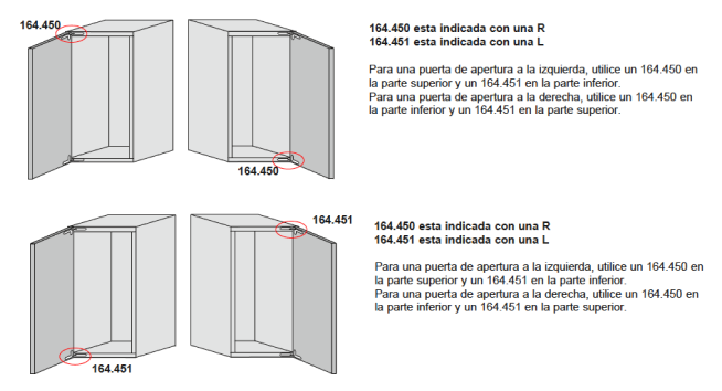 - Para una puerta de apertura a la izquierda, utilice un 164.450 en la parte superior y un 164.451 en la parte inferior.