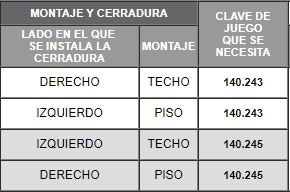 Para más referencia de instalación revise la tabla en dónde se indica el lado correcto del montaje, tanto de la cerradura como del sistema.