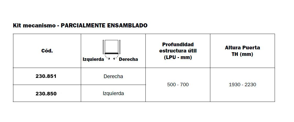 | Instalación del sistema de apertura | Simétricas (ambas puertas) | Simétricas (ambas puertas) | Derecho / Izquierdo | Derecho / Izquierdo | Derecho / Izquierdo | Simétricas (ambas puertas) | Simétricas (ambas puertas) | Derecho / Izquierdo |