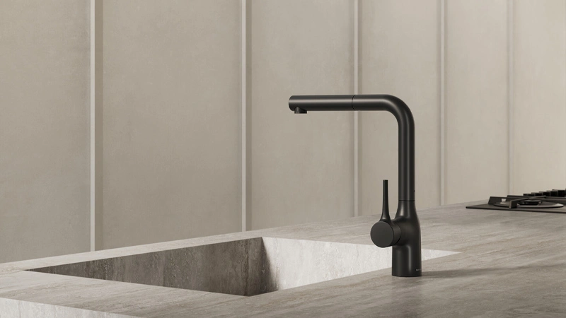 La colección Mania se distingue por su armonioso equilibrio estético, presente tanto en el cuerpo del fregadero como en la palanca, ofreciendo además funcionalidad y ergonomía para tus espacios.
