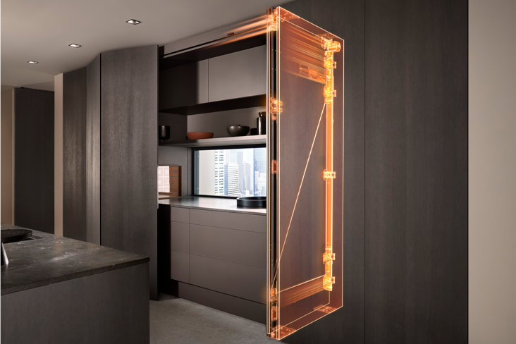 Con REVEGO, los frentes ocultan por completo el pocket y los muebles interiores, logrando un cierre preciso y limpio.