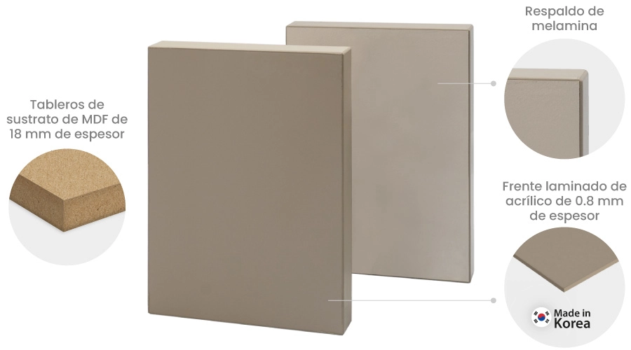 Material Acrílico (frente)/Melamina (respaldo)/Sustrato MDF (tablero)