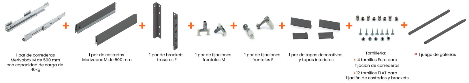 Todos los componentes necesarios para el armado de un cajón MERIVOBOX E contenidos en un solo empaque. Seleccione el tipo de cajón para poder adquirir los elementos adicionales del cajón de galerías, BOXCAP o BOXCOVER.