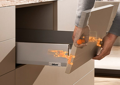 Enganche fácilmente el frente – incluso cuando el cajón está cerrado. Gracias a la posición de fijación, podrá desmontar frentes muy anchos sin esfuerzo, incluso sin ayuda de otra persona.