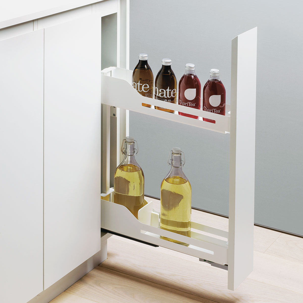 Los elementos estrechos son perfectamente visibles cuando se extraen. Un sencillo sistema de extracción es la mejor solución para los espacios desaprovechados de armarios bajos y armarios altos. Así se gana mucho espacio y se puede ver el fondo del armario.