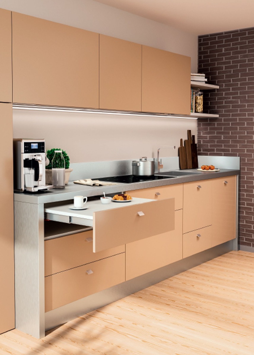 Mecanismo para mesa extensible para colocar en cajón. Para muebles con un mínimo de profundidad de 540 mm. Para la cubierta se recomienda de 16 mm de espesor.