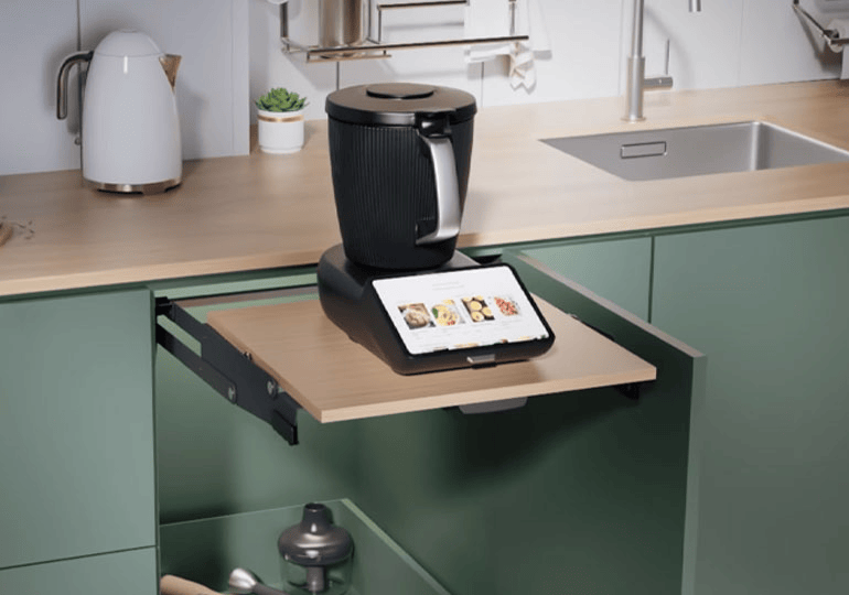 El mecanismo extraíble ChefsTable, es una superficie de apoyo para la cocina, su herraje pivotante hace desaparecer los aparatos de cocina voluminosos en el mueble bajo.
