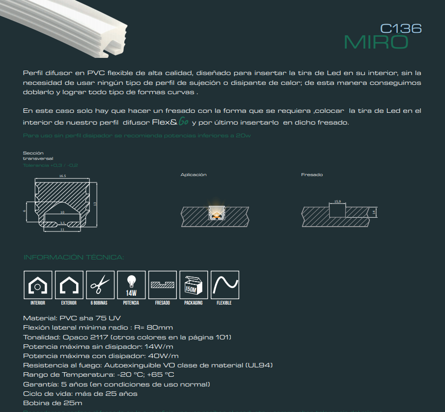 Perfil difusor en PVC flexible de alta calidad, diseñado para encajar directamente sin la necesidad de usar ningún tipo de perfil de sujeción o disipante de calor.