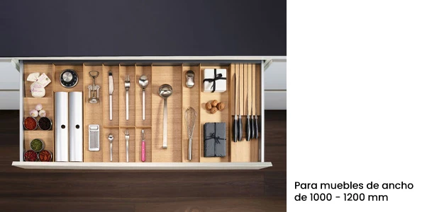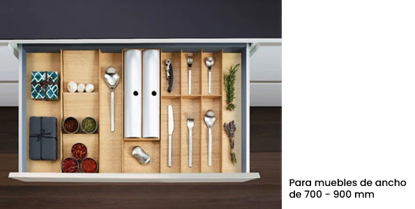 Los accesorios funcionales adicionales como el cuchillero, el especiero o el porta rollos doble complementan perfectamente la organización interior. Además, su base de dos piezas garantiza la máxima flexibilidad y un aspecto uniforme dentro del cajón, evitando contrastes de color y asegurando un acabado de alta calidad.
